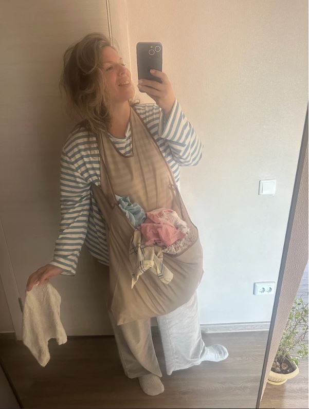Это супер удобно: с фартуком вы легко перенесете чистое белье из стиральной машинки к сушилке, ничего не потеряв по дороге, и вам не надо будет каждый раз наклоняться к тазику при его развешивании.