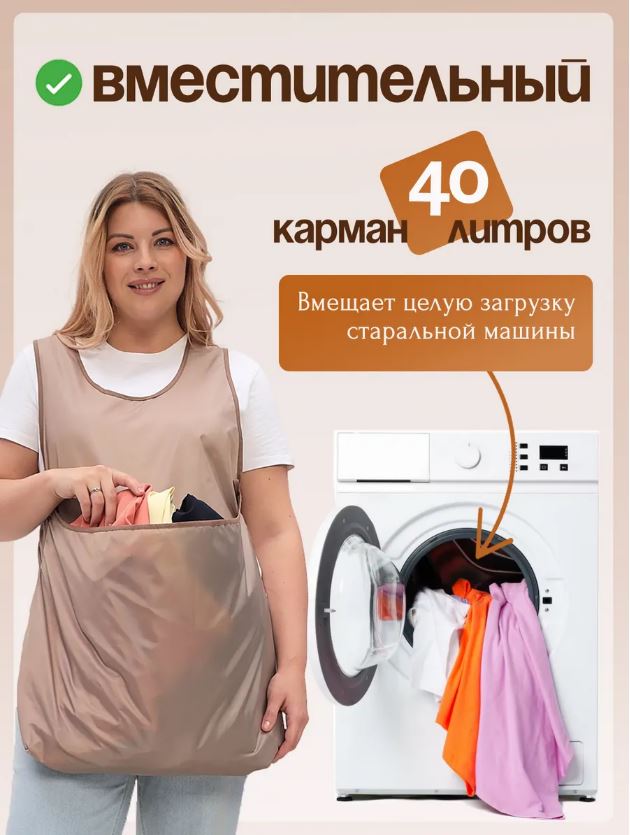 Карман у фартука очень вместительный - 40 литров и в него поместится полная загрузка белья даже из машинки на 9 кг.