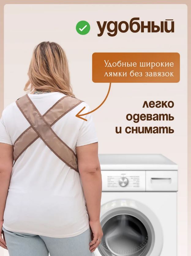 Фартук имеет широкие лямки благодаря которым снижается нагрузка на спину и они не сдавливают шею и плечи! При его использовании вы бережете спину, т.к. не нужно наклоняться и поднимать тяжелый таз с бельем.